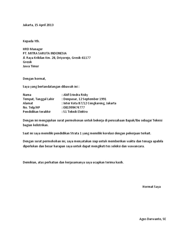 Contoh Surat Lamaran Kerja Di Pabrik Kayu Lapis Nusagates from imgv2-2-f.scribdassets.com Akan tetapi persaingan dalam mendapatkan pekerjaan juga sangat ketat. Dan berikut kami akan memberikan contoh surat lamaran kerja lengkap. 10 contoh surat penawaran dan cara membuatnya paling lengkap. Surat lamaran kerja adalah suatu dokumen resmi yang harus kita buat jika ingin melamar suatu pekerjaan, baik itu di pabrik, di toko, di kantor, di bank, maupun di hotel. Buatlah surat lamaran kerja pabrik anda menggunakan bahasa yang formal sesuai dengan kaedah bahasa indonesia yang baik dan benar. Surat lamaran kerja merupakan salah satu syarat untuk mendapatkan pekerjaan yang ingin anda dapatkan. Anda hanya perlu untuk menggantikan nama, posisi untuk melamar pekerjaan di pt atau pabrik anda harus menonjolkan kelebih di dalam diri anda pada surat lamaran tersebut. Anda sedang membuka postingan contoh surat lamaran kerja pabrik yang berada pada kategori contoh surat dengan tag postingan berikut contoh terimakasih telah berkunjung di gawe cv pada post contoh surat lamaran kerja pabrik.